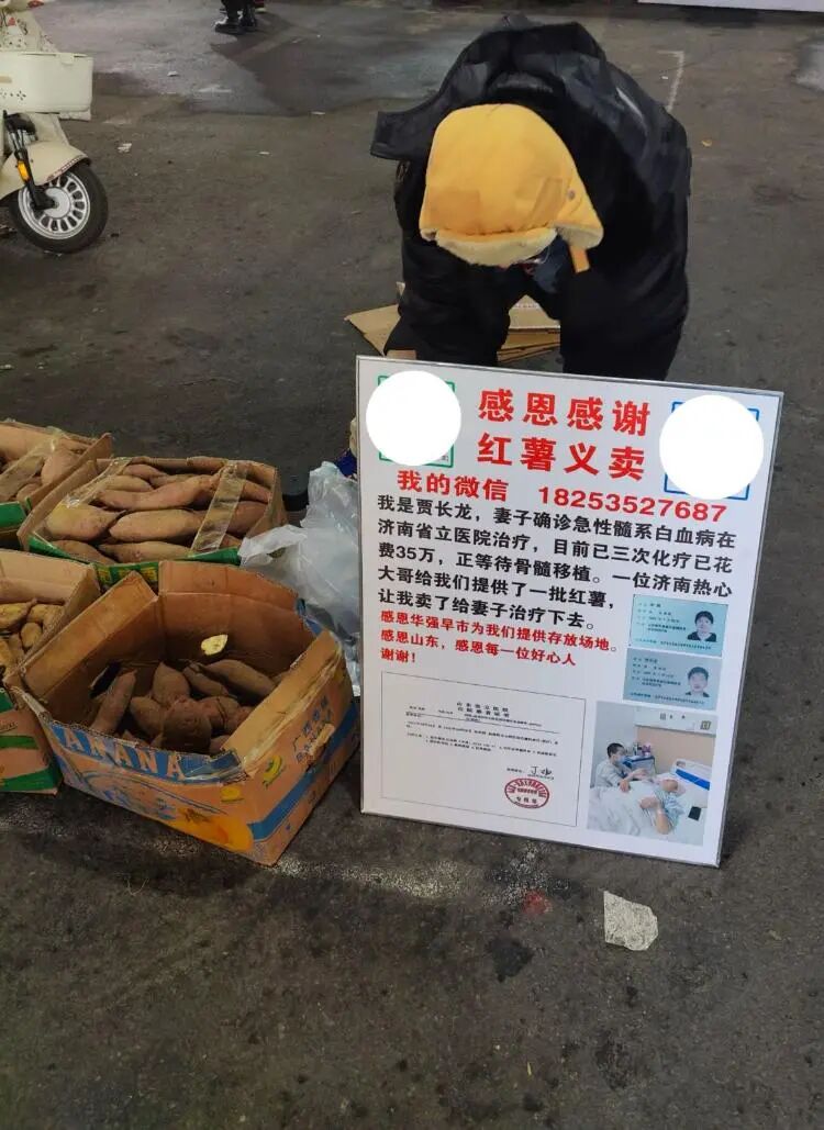近日,济南市华强早市出现了一个特别的摊位。烟台市民贾长龙在此售卖地瓜,为身患白血病的妻子筹集治疗费用。这批地瓜共十万斤,由济南市莱芜区一位好心大哥匿名捐赠。