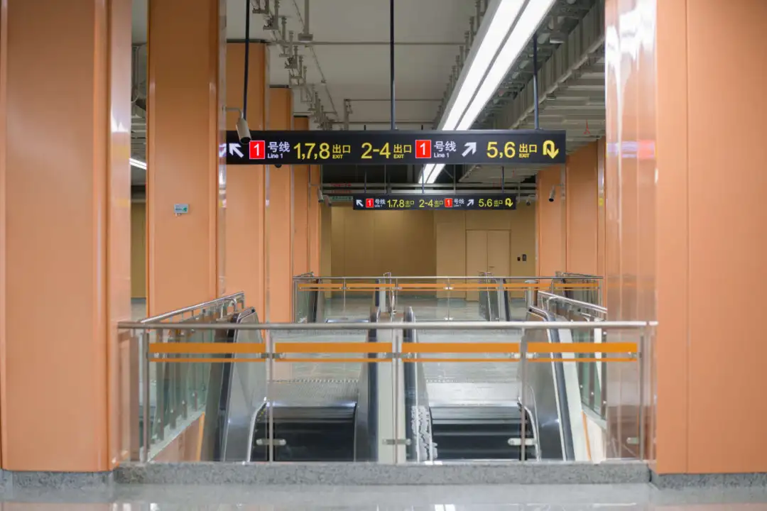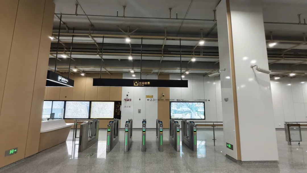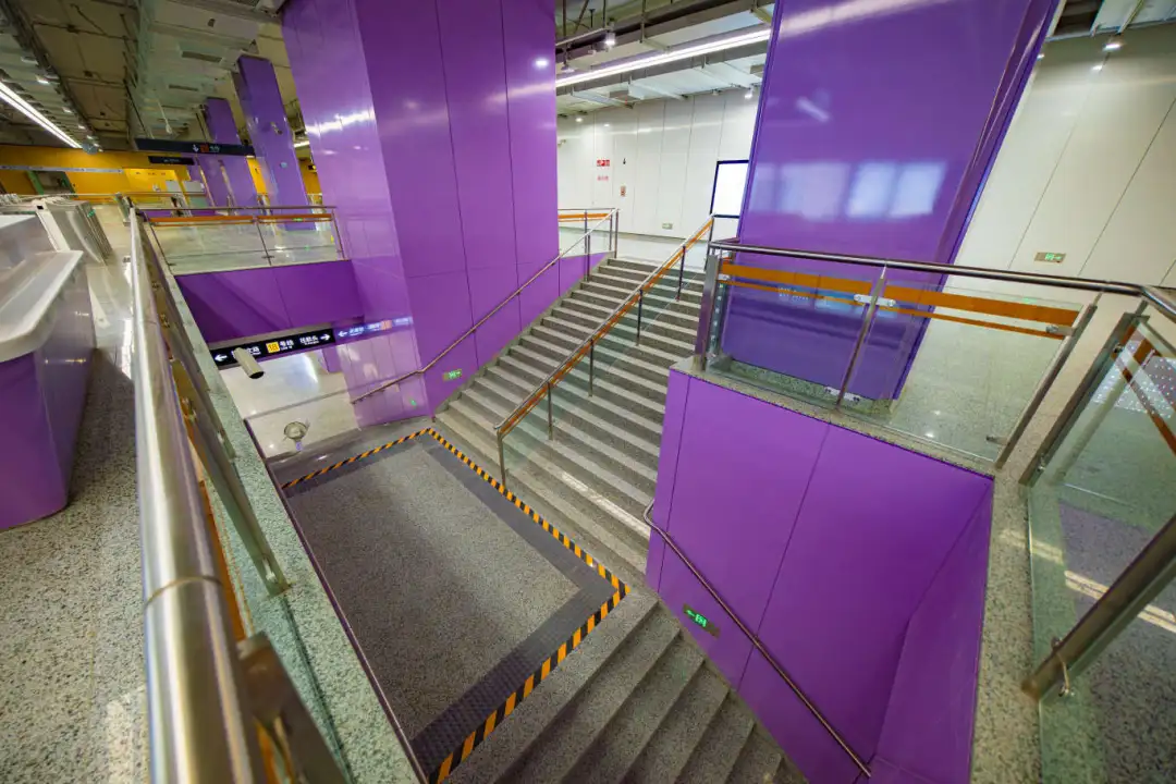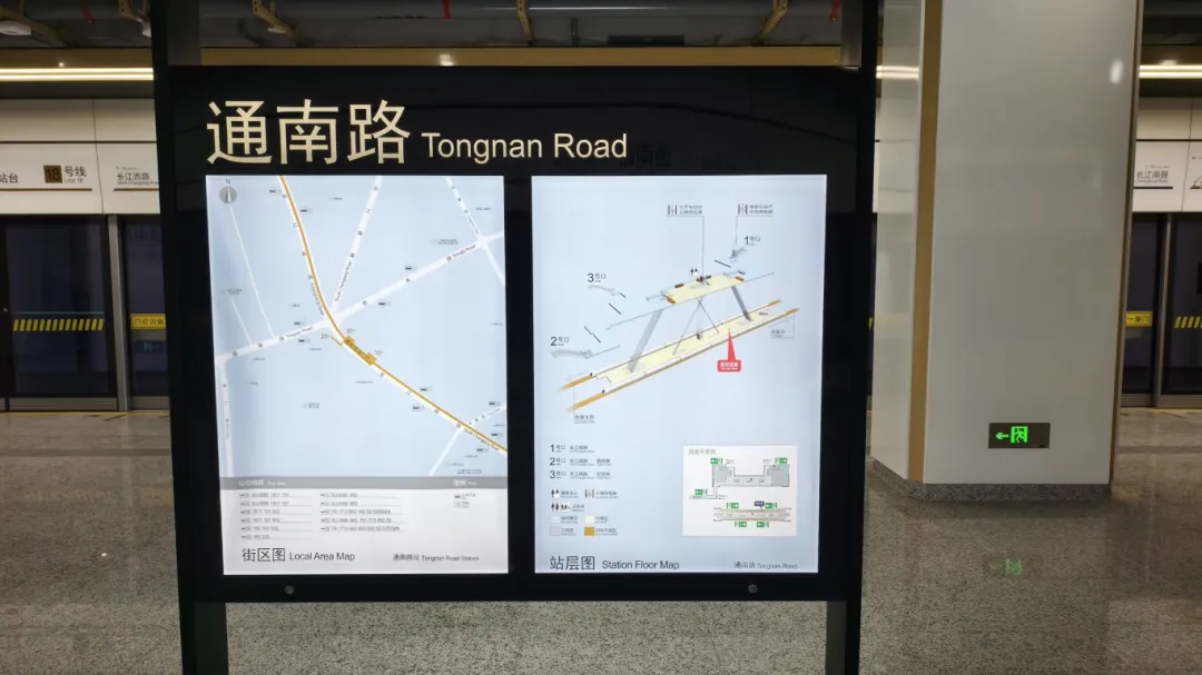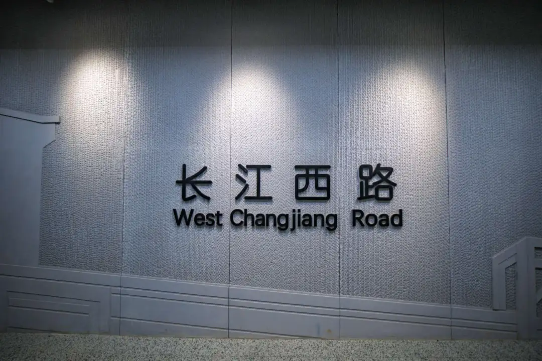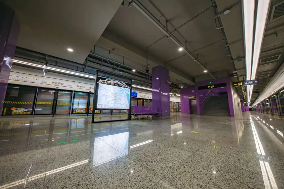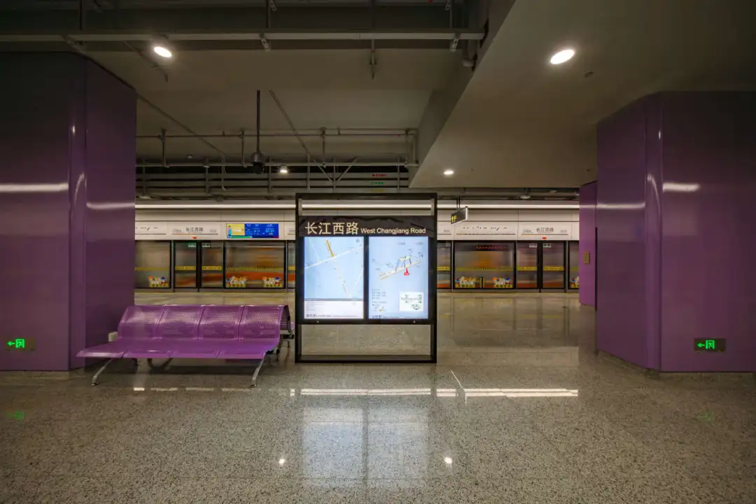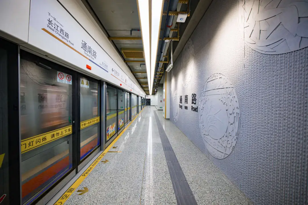 江杨南路站(暂不开通)通过大型LED灯块,形成五光十色的撞色空间;站名墙以型钢厂旧址风貌,传承钢城精神,延续工业历史记忆。