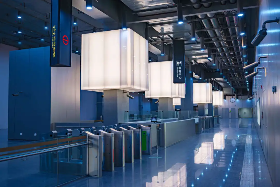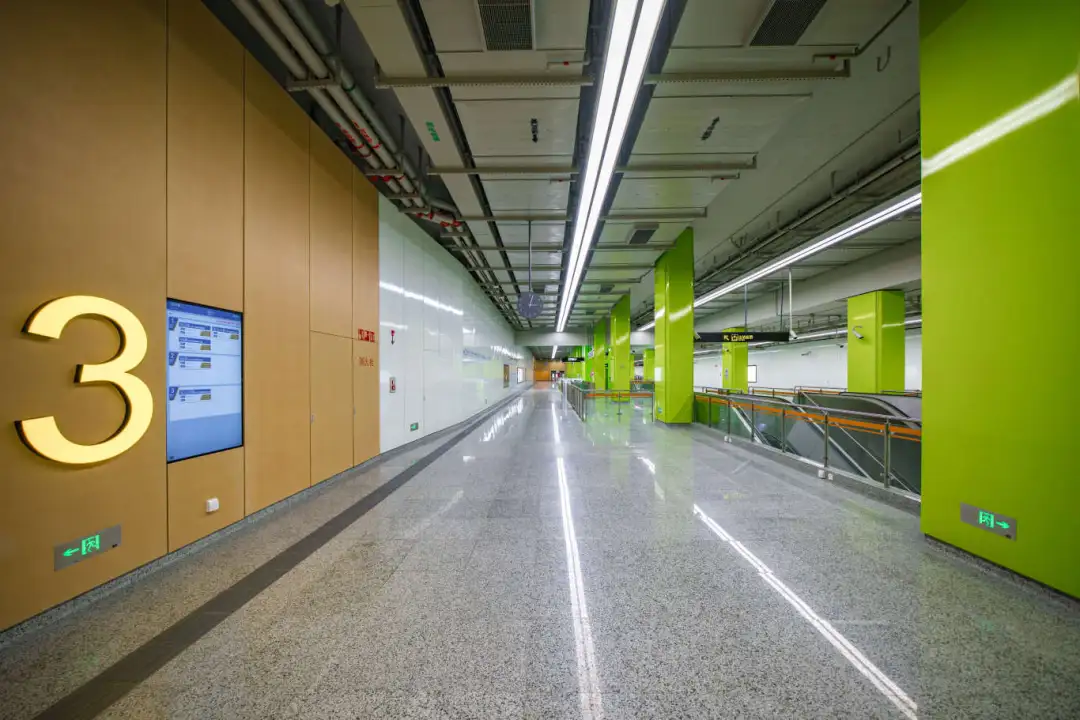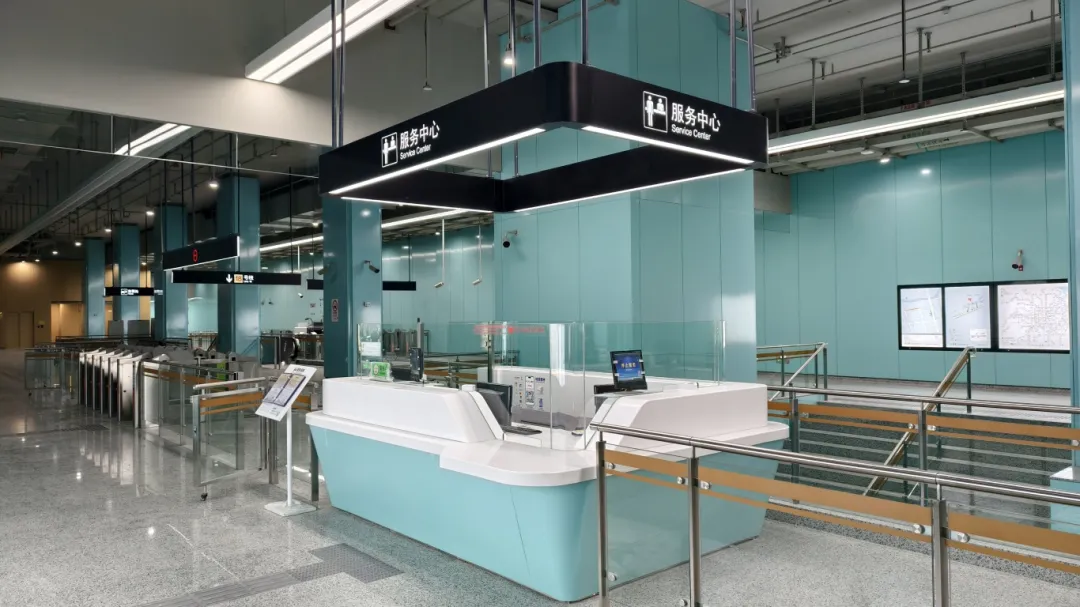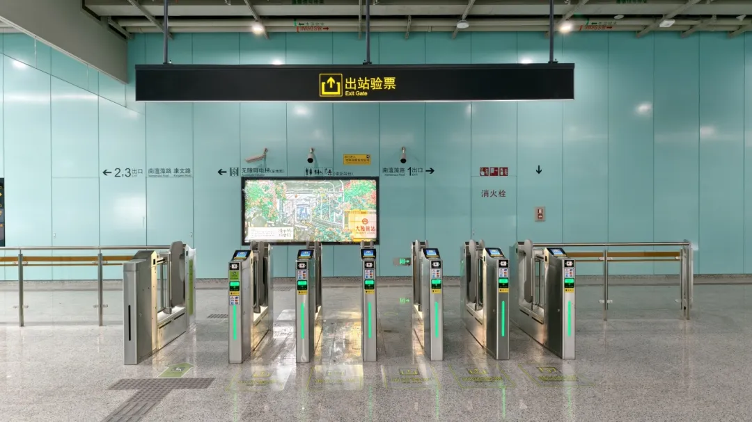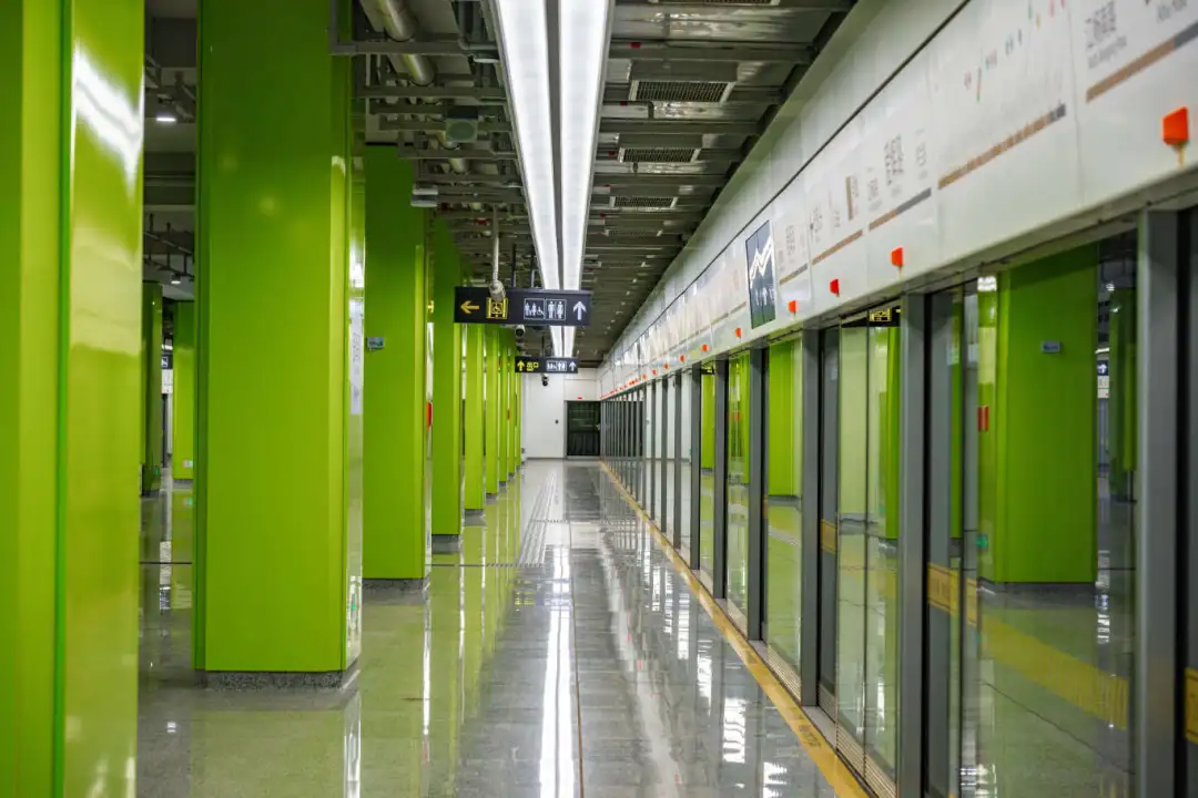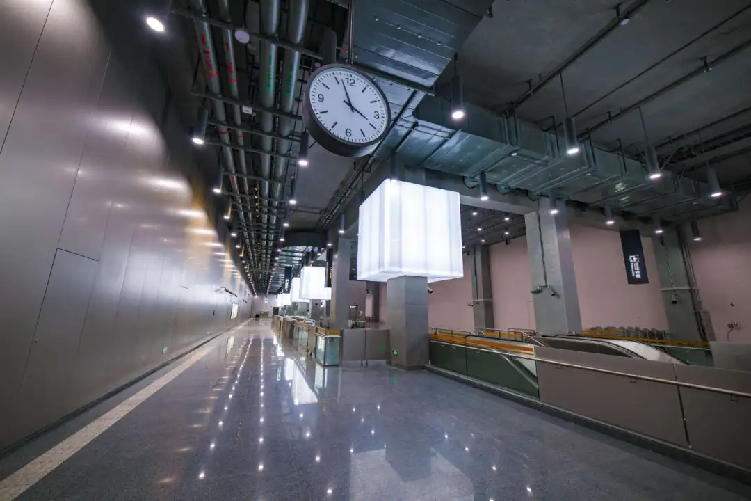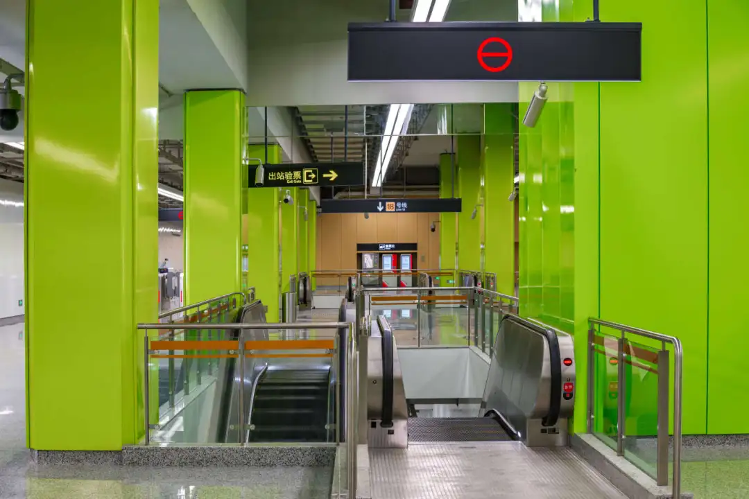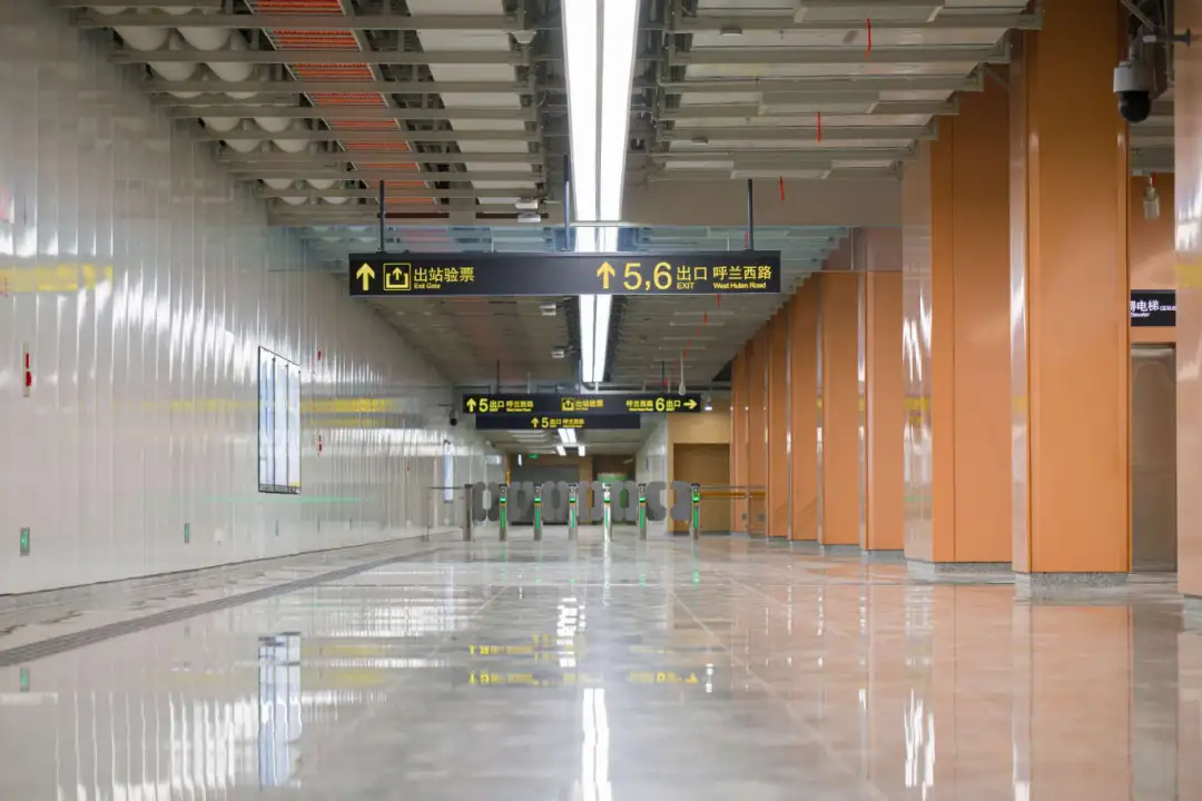 江杨南路站(暂不开通)通过大型LED灯块,形成五光十色的撞色空间;站名墙以型钢厂旧址风貌,传承钢城精神,延续工业历史记忆。