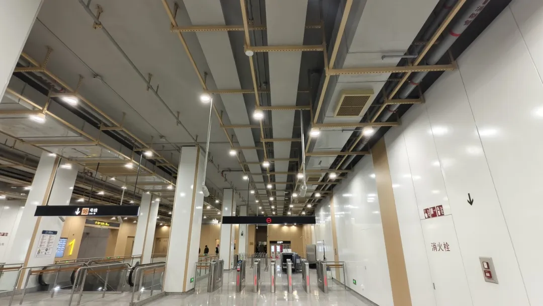 通南路站的综合支吊架设计,创新融入中国传统建筑中的“斗拱”结构美学,采用两侧向中间或中间向两侧依次抬高的布置形式,科学布局管线系统,支架布置错落有致,最高处接近6米,兼顾功能效率与空间体验,有效提升了车站视觉空间的净高。让地铁空间更具现代感。