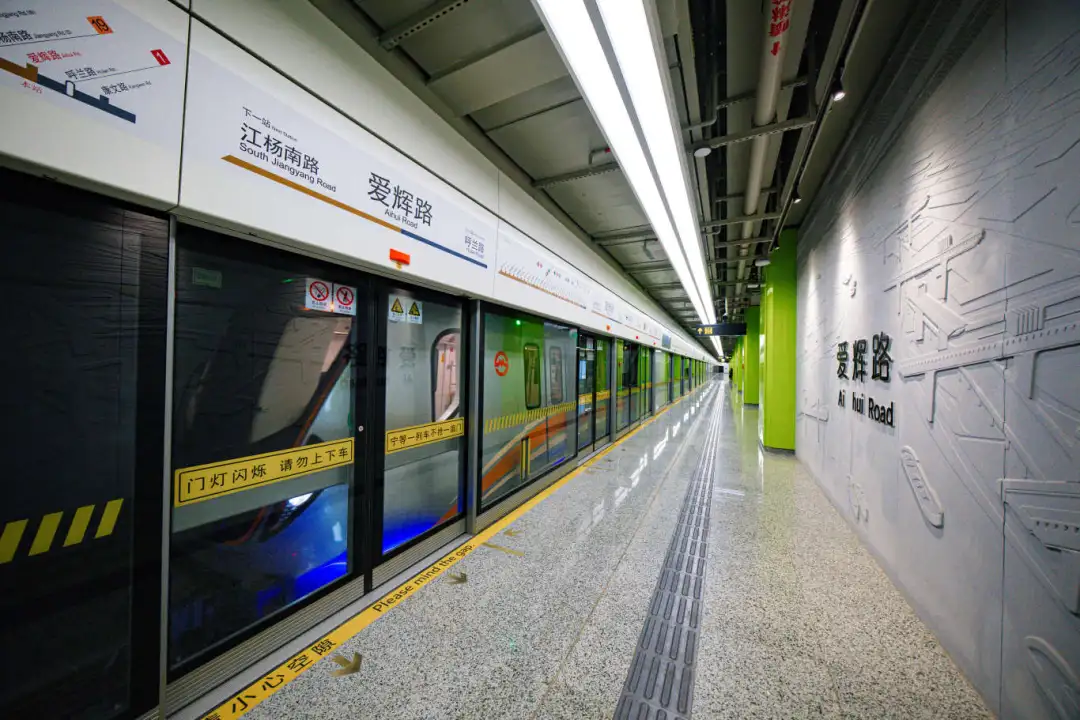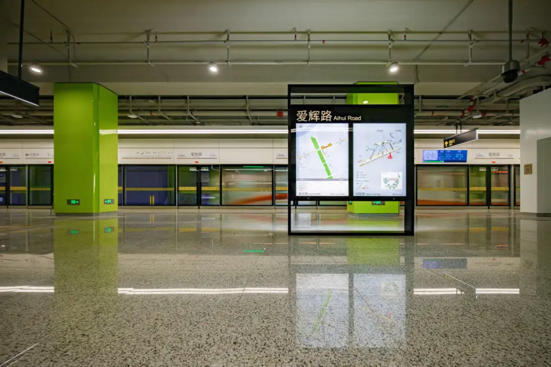 爱辉路站以青柠色绽放生机希望,站名墙再现了当年的储运码头现场情景。