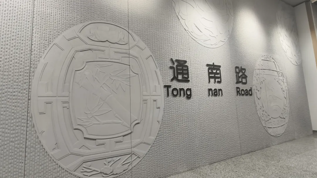 通南路站主打暖浅木色,温润舒适,站名墙浮雕呈现传统淞南蛋雕非遗技艺。
