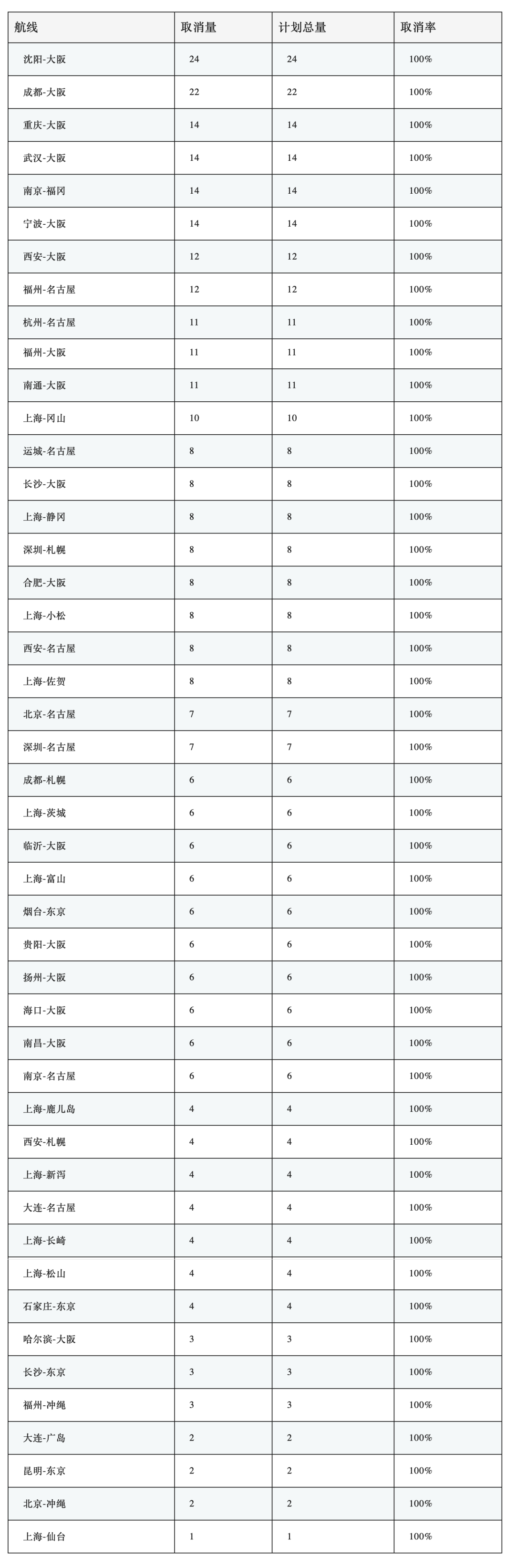 航班管家最新统计显示,2026年1月中国大陆往返日本航班取消量已达2195班次,整体取消率40.4%;其中46条中日航线在未来两周(2025年12月23日—2026年1月5日)内计划航班全部取消,取消率100%,涉及中日双方共38座机场。