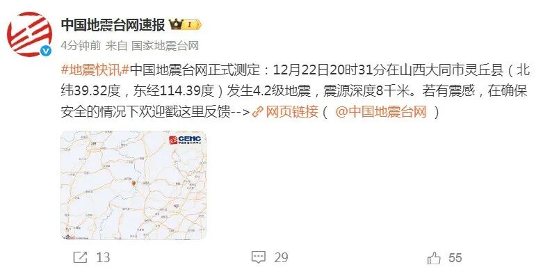 中国地震台网正式测定:12月22日20时31分在山西大同市灵丘县(北纬39.32度,东经114.39度)发生4.2级地震,震源深度8千米。