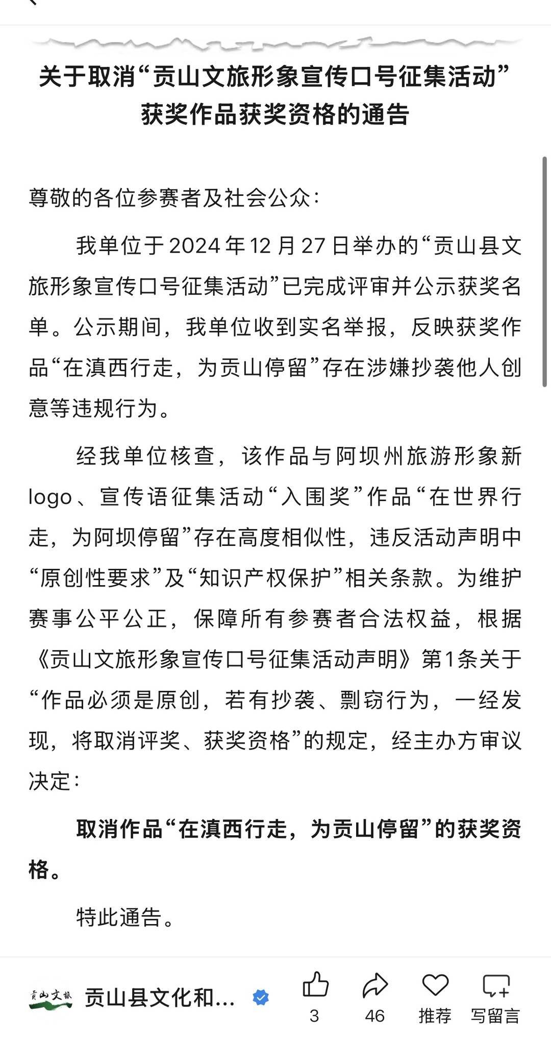 贡山县文旅宣传语征集活动中的入围奖被举报抄袭,官方取消资格。
