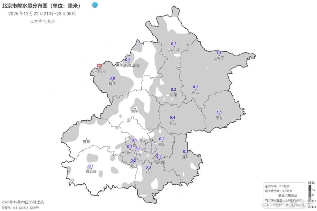 全市平均降雪量为0.3毫米,城区平均降雪量为0.2毫米,城区及平原大部分地区积雪深度不足1厘米,最大降雪量出现在延庆区小海陀站3.3毫米,山区局地积雪深度1~3厘米。
