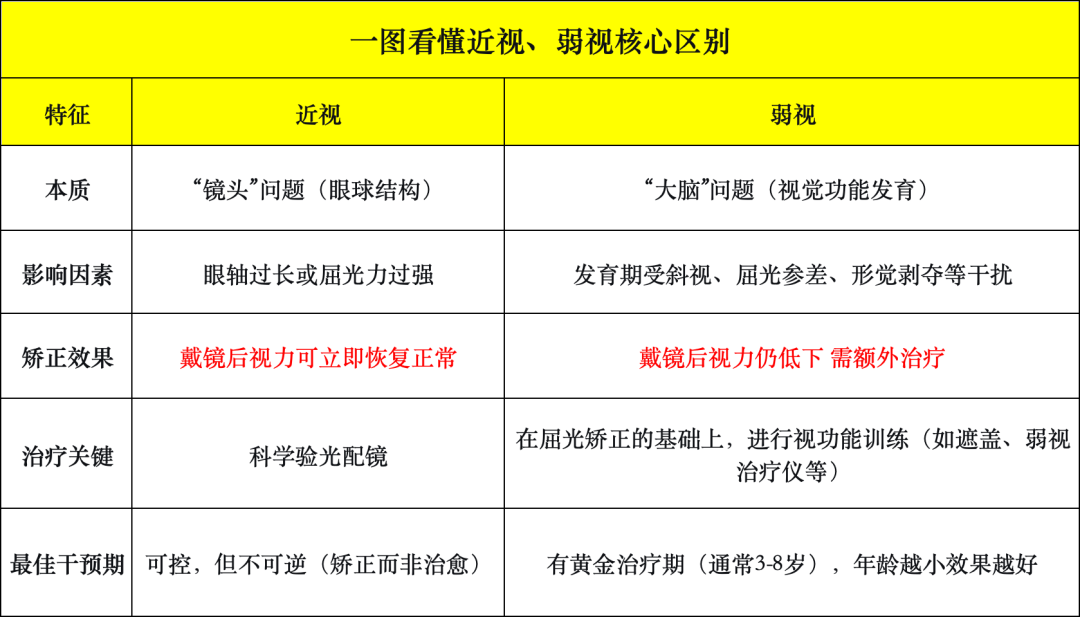需要注意的是,与近视可以通过配戴眼镜等方式矫正不同,弱视儿童如果没有及时、恰当地治疗,很有可能会造成终身的视力低下。