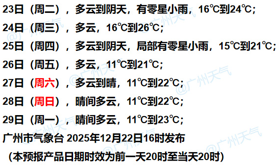 广州市气象台预计,受东南风增大影响,12月23日广州多云到阴天,有零星小雨。12月24日广州以多云为主,12月25日受新一股冷空气影响,气温下降。