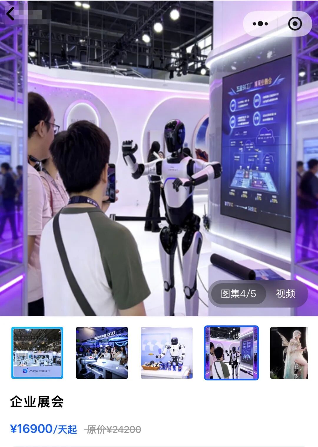 页面显示,如在公司年会场景,租赁价格为13300元/天起步,机器人功能包括迎宾签到、拍照打卡、赛博主持、节目展演等;企业展会租赁价格为16900元/天起步,机器人可提供迎宾接待、讲解互动、嘉宾礼赠、书法祝福等服务。
