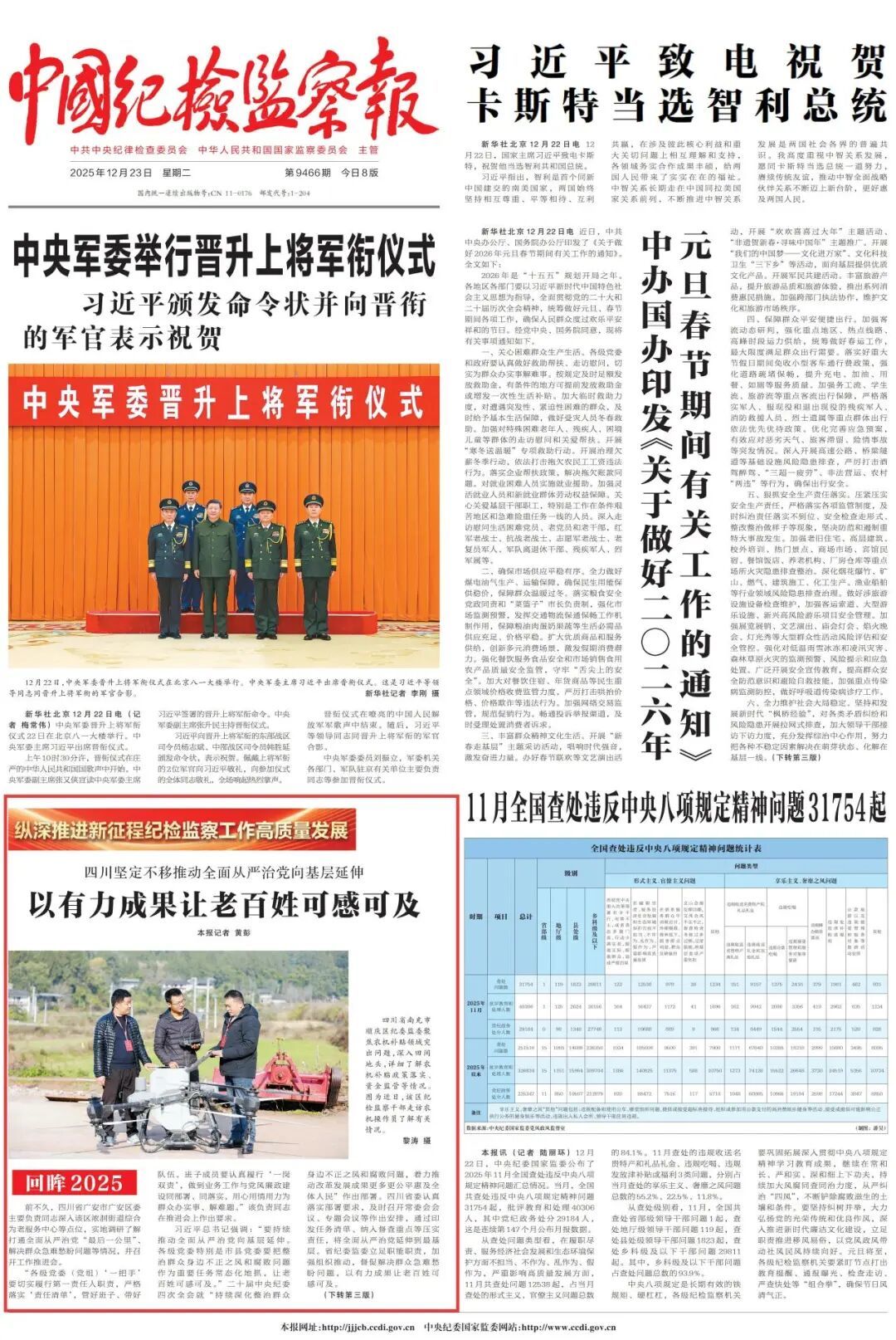 2025年12月23日,《中国纪检监察报》头版刊发《回眸2025——四川坚定不移推动全面从严治党向基层延伸 以有力成果让老百姓可感可及》。