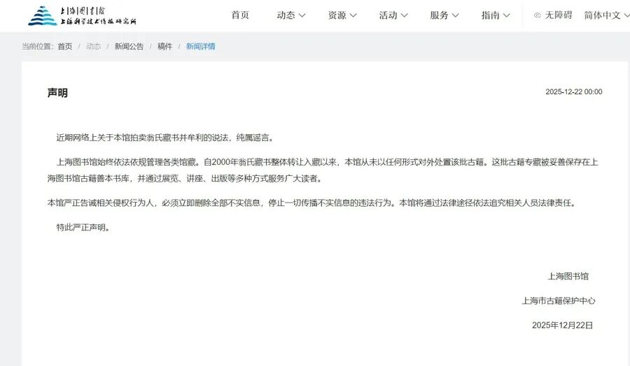 12月22日,上海图书馆发布辟谣声明,以下为具体内容: