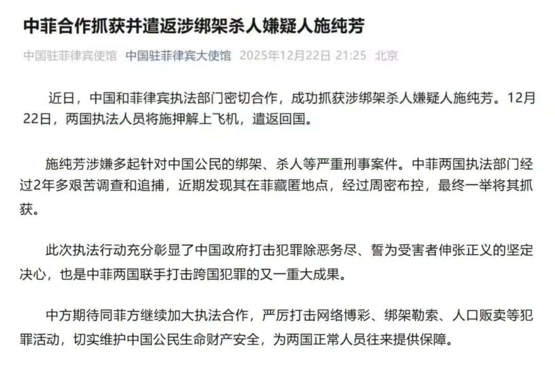 涉绑架杀人嫌疑人施纯芳,被遣返回国! 据中国驻菲律宾大使馆消息,近日,中国和菲律宾执法部门密切合作,成功抓获涉绑架杀人嫌疑人施纯芳。据悉,施纯芳涉嫌多起针对中国公民的绑架、杀人等严重刑事案件。12月22日,两国执法人员将施押解上飞机,遣返回国。