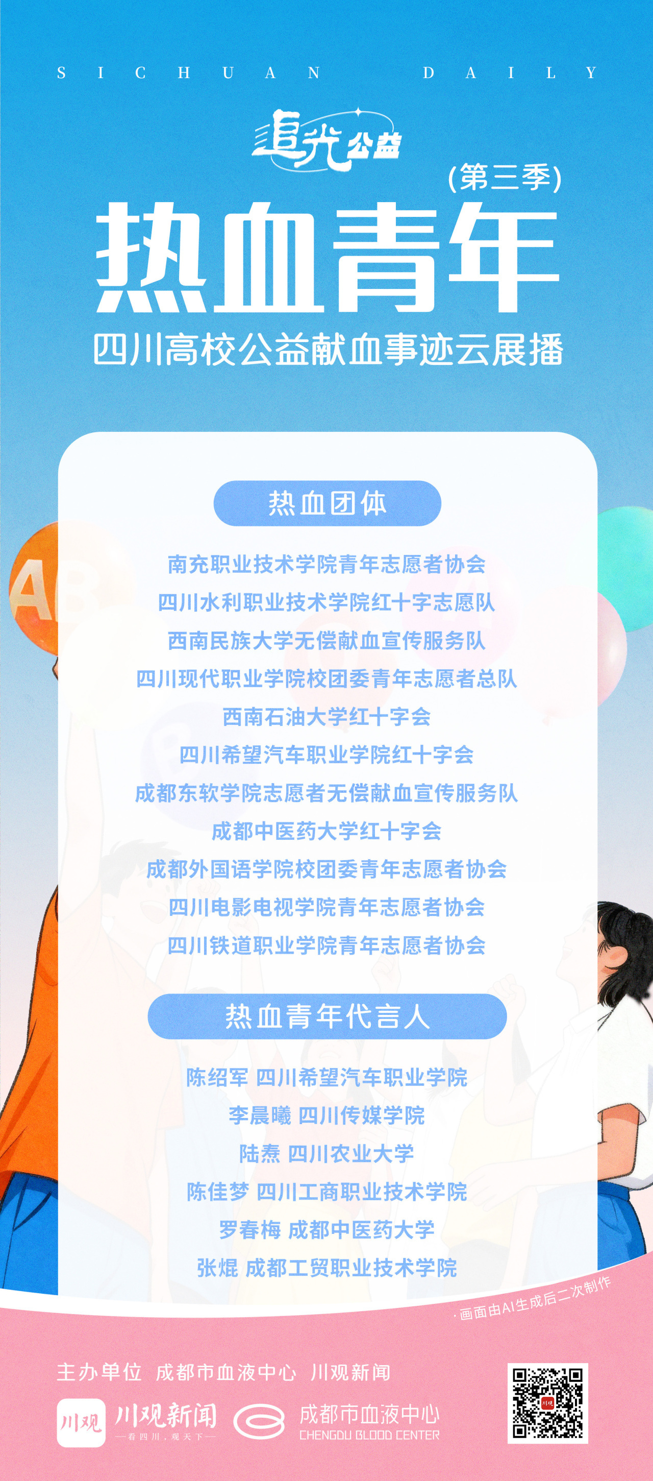 一滴热血,汇聚成川;一份赤诚,点亮青春。11月21日,成都市血液中心联合川观新闻推出的第三季“四川高校公益献血事迹云展播”+首届热血青年代言人候选人展播正式开启。