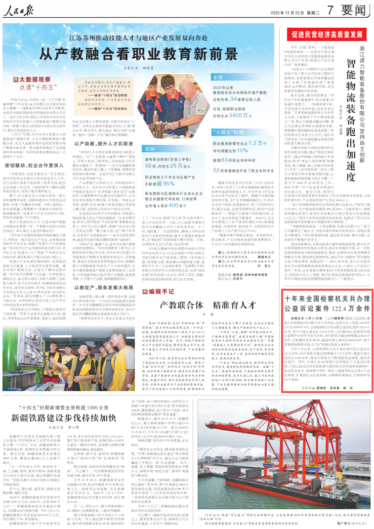 最高人民法院、最高人民检察院12月22日联合举行发布会,记者从会上获悉:2015年7月至2025年9月,全国检察机关共办理公益诉讼案件122.4万余件,其中行政公益诉讼110.2万件,占比超90%;将审前实现公益保护目的作为优先目标,向行政机关提出检察建议86.8万余件,回复整改率达98.5%;提起行政公益诉讼8000余件,绝大多数得到裁判支持,以“诉”的确认推进公益保护。