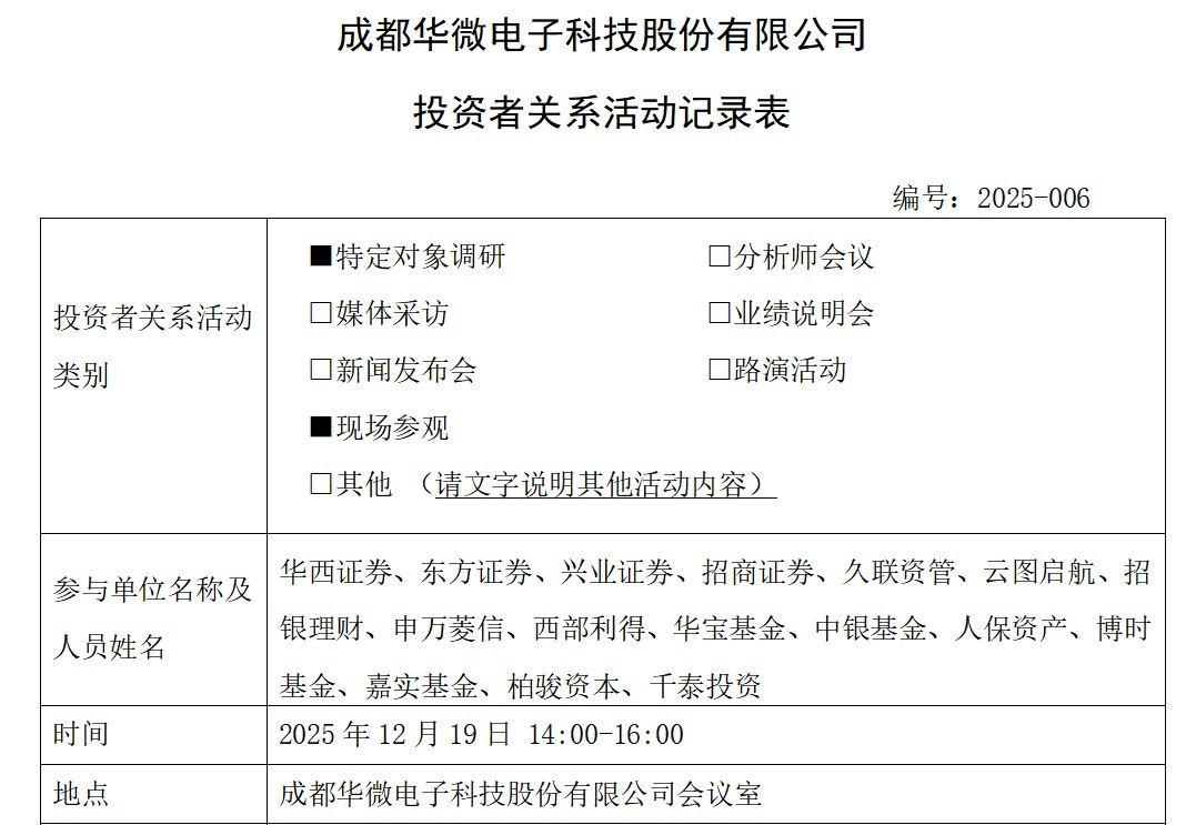 从公司最新披露的投资者关系活动记录表来看,12月19日下午2点至4点,华西证券、东方证券、兴业证券、招商证券、久联资管、云图启航、招银理财、申万菱信、西部利得、华宝基金、中银基金、人保资产、博时基金、嘉实基金、柏骏资本、千泰投资在内的16家机构投资者对成都华微进行了实地调研。