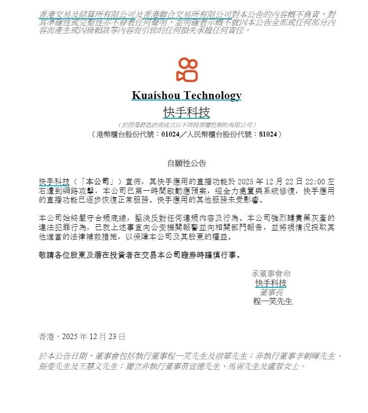 12月23日午间,快手(01024.HK)在港交所发布公告称,公司快手应用的直播功能于2025年12月22日22:00左右遭到网路攻击,公司已第一时间启动应急预案,经全力处置与系统修复,快手应用的直播功能已逐步恢复正常服务。