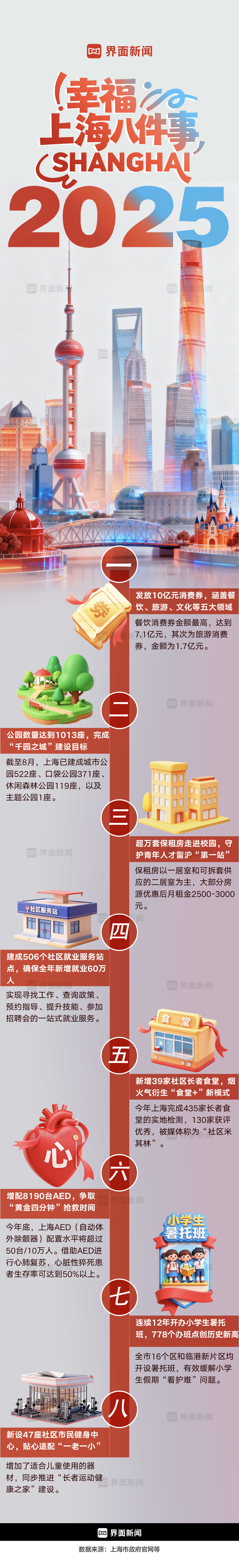 从发放10亿元“乐·上海”服务消费券激活市场活力,到提前建成“千园之城”兑现绿色承诺;从筹措万套保租房守护青年人才起步梦想,到500余个社区站点织密家门口的就业服务网络;从连续12年开设的爱心暑托班缓解小学生假期“看护难”,到新增8190台AED(自动体外除颤器)为城市筑牢生命防线;再到遍布上海的长者食堂与社区健身空间,持续提升着市民的生活品质与便利度。