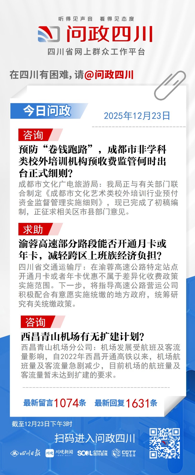 问政四川网友提问:我是一名学生家长,《成都市非学科类校外培训机构预收费监管工作实施细则(试行)》已过两年试行期,目前已超期半年,正式规定尚未出台。试行期结束后缺正式规定,可能影响监管效力,给家长和学生权益带来潜在风险。为有效遏制机构过高收费、卷款跑路等乱象,请问正式规定何时能出台?
