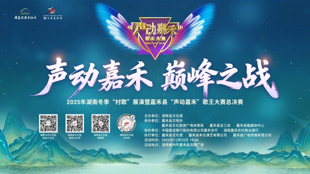 12月23日19:00,2025年湖南冬季“村歌”展演暨嘉禾县“声动嘉禾”歌王大赛总决赛将在湖南省郴州市嘉禾县双拥广场举办,国家公共文化云全程直播。