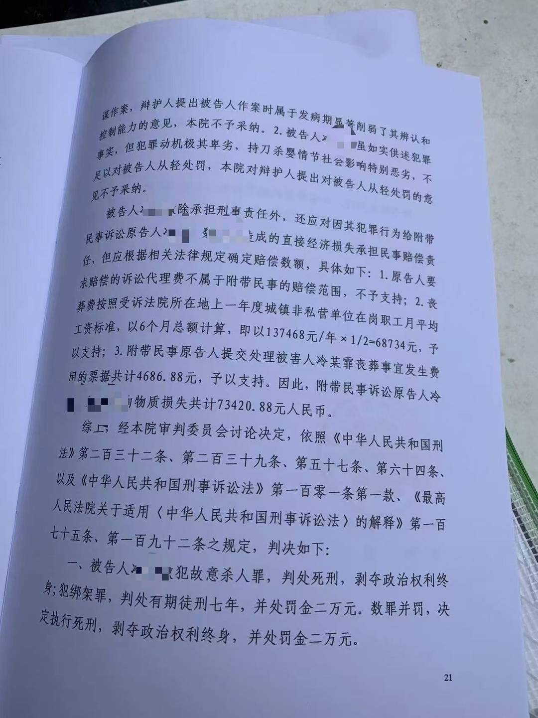 冷某敏此前提出进行精神鉴定,向法院提交自己作案时处于发病期间,显著削弱了其辨认和控制能力的辩护意见。判决书显示,法院不予采纳,此外,冷某敏虽如实供述犯罪事实,但犯罪动机极其卑劣,犯罪情节、社会影响特别恶劣,不足以对被告人从轻处罚,法院对辩护人提出对被告人从轻处罚的意见不予采纳。