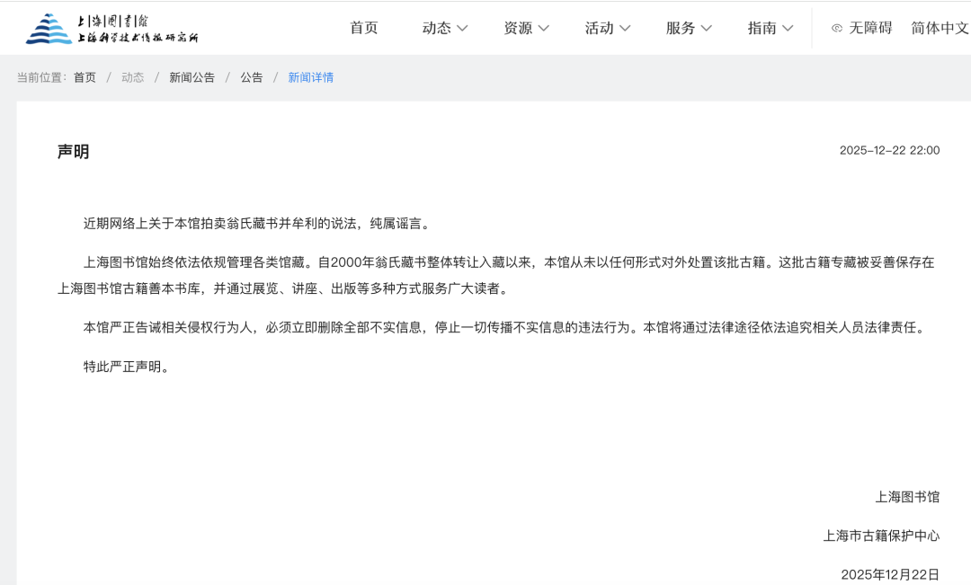 12月22日,上海图书馆发布辟谣声明,以下为具体内容:
