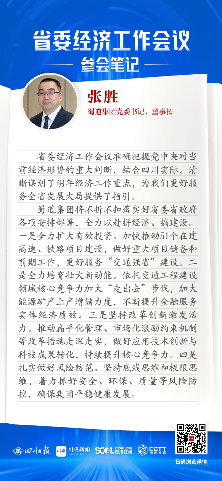蜀道集团将不折不扣落实好省委省政府各项安排部署,全力以赴拼经济、搞建设。一是全力扩大有效投资。加快推动51个在建高速、铁路项目建设,做好重大项目储备和前期工作,更好服务“交通强省”建设。二是全力培育壮大新动能。依托交通工程建设领域核心竞争力加大“走出去”步伐,加大能源矿产上产增储力度,不断提升金融服务实体经济质效。三是坚持改革创新激发活力。推动扁平化管理、市场化激励约束机制等改革措施走深走实,做好应用技术创新与科技成果转化,持续提升核心竞争力。四是扎实做好风险防范。坚持底线思维和极限思维,着力抓好安全、环保、质量等风险防控,确保集团平稳健康发展。