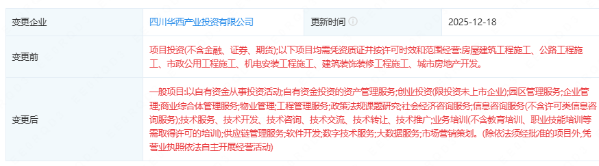 记者注意到,12月18日,华西产投变更了经营范围,从此前不含金融、证券、期货的项目投资及建筑施工领域,变更为资产管理服务、创业投资、园区管理服务、企业管理等。
