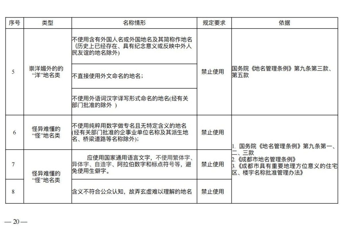 避免重名同音:规定在市辖区、市政府确定的特定区域或其他县级行政区划范围内,住宅区、楼宇名称不得重名、同音,并禁止通过简单增减“大”“新”“成都”等字词制造名称混淆。
