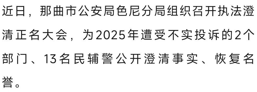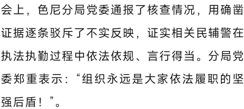 此次澄清正名大会,既是对民辅警依法履职的坚定支持,更是维护执法权威、严明纪律规矩的重要抓手。下一步,色尼分局将持续健全完善执法维权保障机制,坚持为担当者担当、为负责者负责、为干事者撑腰,激励全体民辅警以更强使命感和责任感,全力投入辖区稳定和群众平安守护工作。