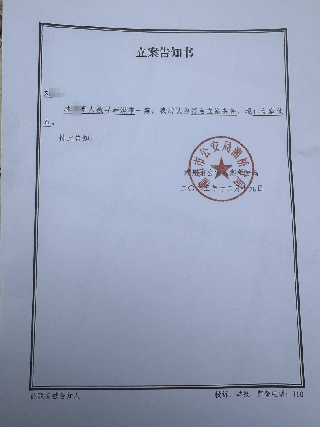 12月19日,据潮州市湘桥公安分局出具了立案告知书,林先生等人被寻衅滋事一案,该局认为符合立案条件,现已立案侦查。