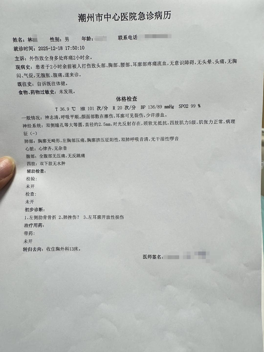 事发后,林先生被送往潮州市中心医院就诊。据医院开具的急诊病历显示,林先生左侧肋骨骨折、肺挫伤、左耳廓开放性损伤。