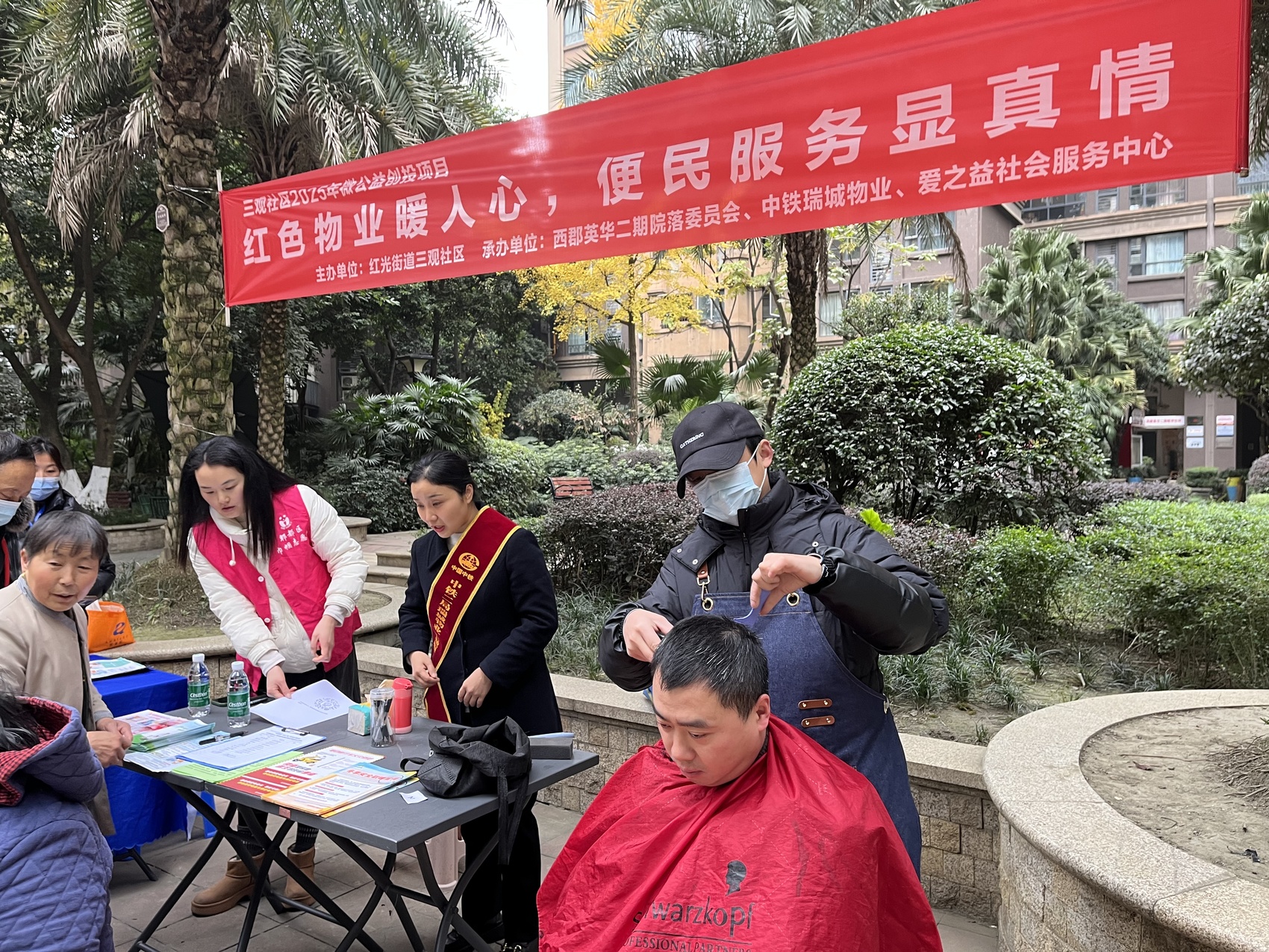 免费理发、健康咨询、政策答疑……这些便民服务不再需要专门寻找,下楼即享。近日,成都市郫都区西郡英华二期小区里,一场由物业与社区联合举办的便民活动,让居民在家门口感受到实实在在的便利。这正是瑞城物业与社区结对共建后,将服务常态化送到居民身边的生动缩影。