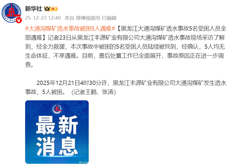 2025年12月21日4时30分许,黑龙江丰源矿业有限公司大通沟煤矿发生透水事故,5人被困。