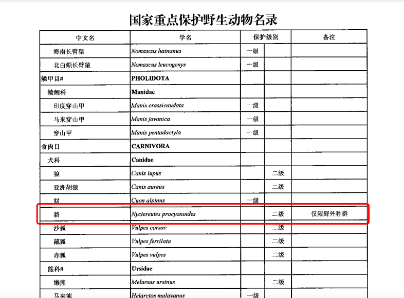 根据《国家重点保护野生动物名录》,貉属于国家二级保护动物。网络截图