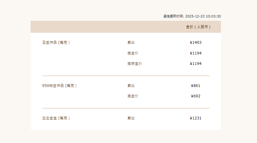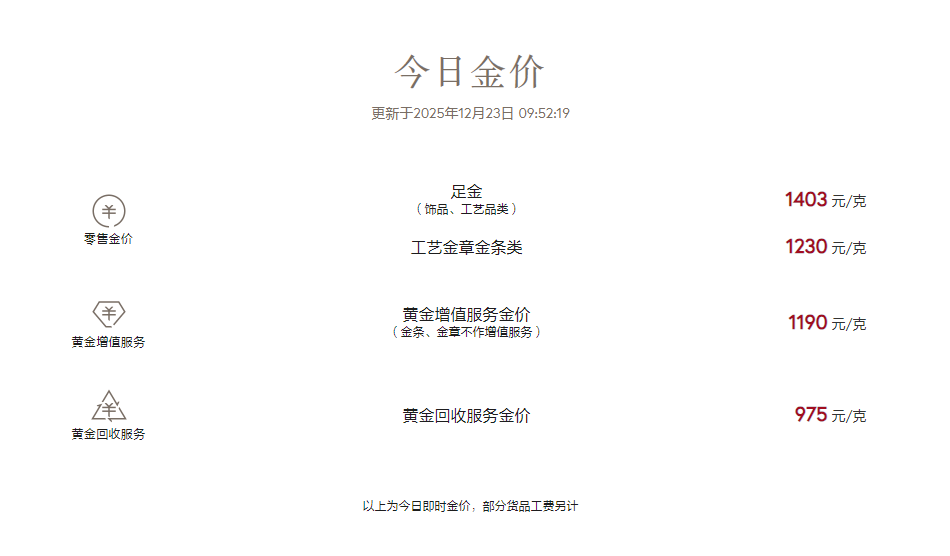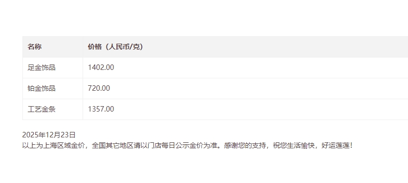 国内品牌金饰受此影响,价格纷纷上涨。12月23日,周生生金饰克价为1403元/克,较前一日上涨36元/克;老凤祥为1399元/克,上涨34元/克;老庙黄金为1402元/克,上涨35元/克。