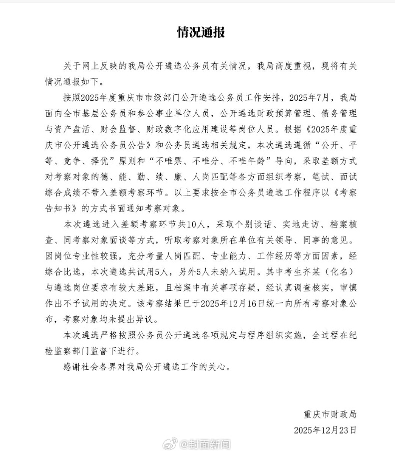 12月23日,重庆财政局发布情况通报,关于网上反映的我局公开遴选公务员有关情况,我局高度重视,称本次遴选进入差额考察环节共10人,采取个别谈话、实地走访、档案核查、同考察对象面谈等方式,听取考察对象所在单位有关领导、同事的意见。