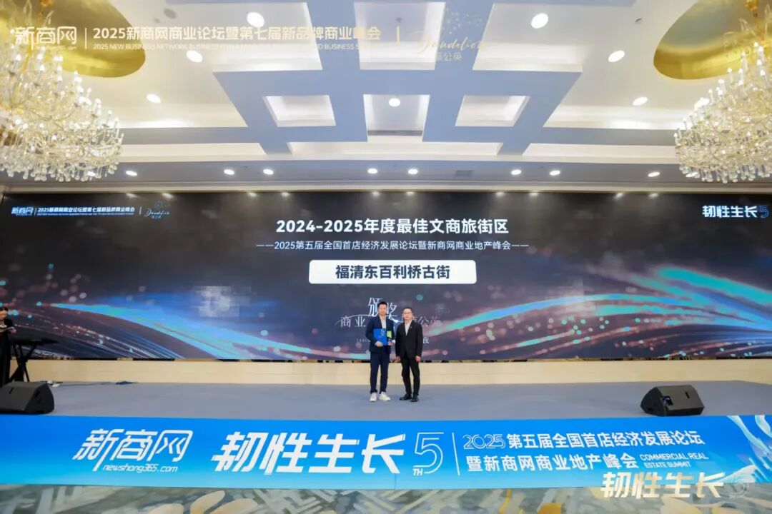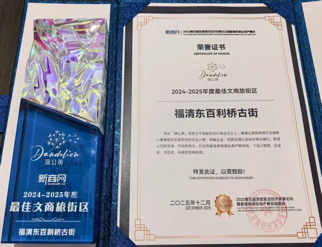本次论坛以“韧性生长”为主题,由新商网、首店早知道、众安商业集团联合主办,是国内首店经济与商业融合领域的重要行业盛典。在当晚举行的“众安之夜”暨商业“蒲公英”颁奖晚宴上,评审专家团围绕历史活化、业态创新、运营成效等核心维度进行综合考评,福清东百利桥古街凭借“历史文脉与现代商业的精准契合”赢得全票认可,成功摘得殊荣。