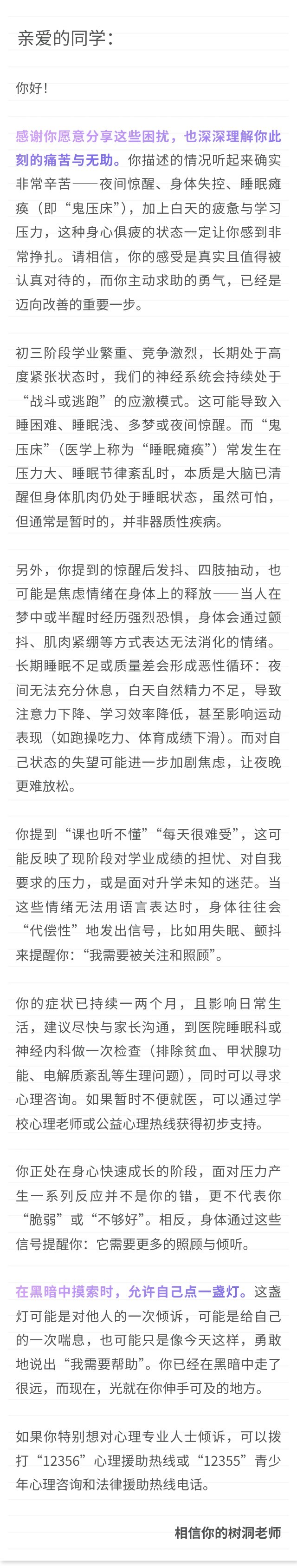 一位16岁初中女生:我是一个初三学生,在最近的一两个月里,我每周大概会有两到三次,半夜惊醒有时醒来后会控制不住的全身发抖,四肢抽动,以及被惊醒时总是会有“鬼压床”的感觉,晚上总是难以入睡。这是为什么,我应该怎么做?感觉好痛苦,每天跑操好痛苦,也没有精力体育也很差。每天都很难受,课也听不懂。