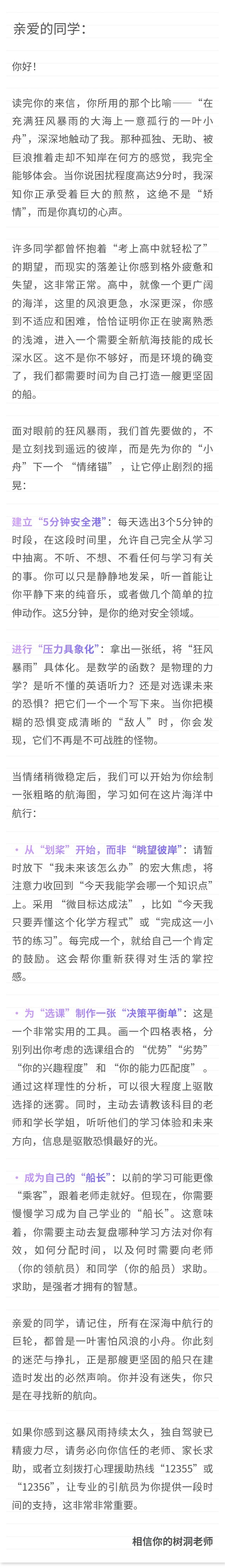 一位17岁的高中生:初三毕业前以为只要考上高中就好了,就可以轻松一点了,但没想到高中压力更大,学习也更困难。面对新的挑战、新的知识和教学方法以及即将到来的选课,我不知道该怎么办才好。我好像迷失了方向,就像在充满狂风暴雨的大海上一意孤行的一叶小舟。