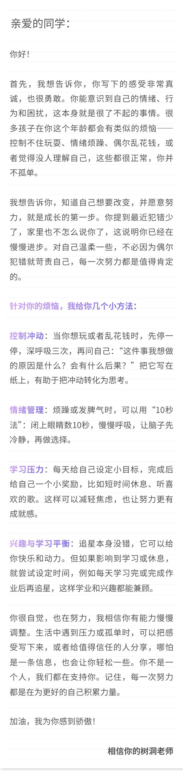 一位12岁小学女生:在自我控制、情绪调节、亲子沟通、学习压力管理和兴趣平衡等方面存在困惑,需要鼓励。