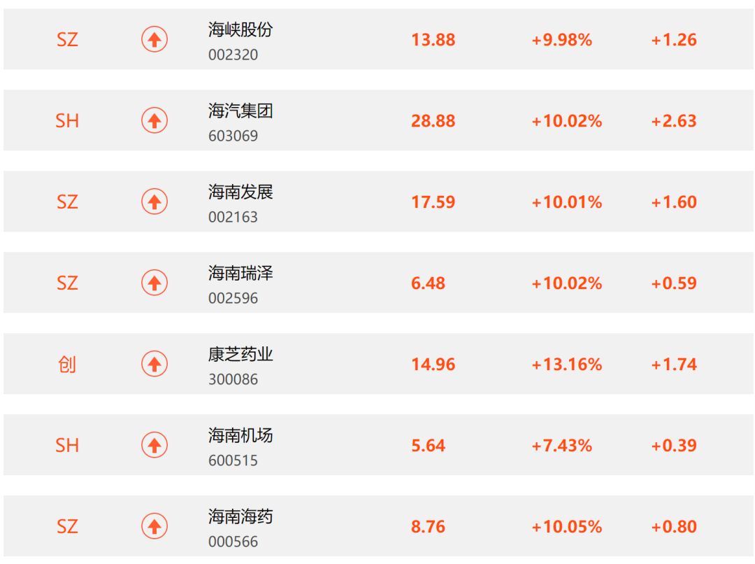 23日早盘,A股三大指数集体高开,海南封关带动相关概念股持续走高领涨大盘。海峡股份、海汽集团、海南发展、海南瑞泽涨停,康芝药业、海南机场、海南海药、神农种业、海马汽车跟涨。