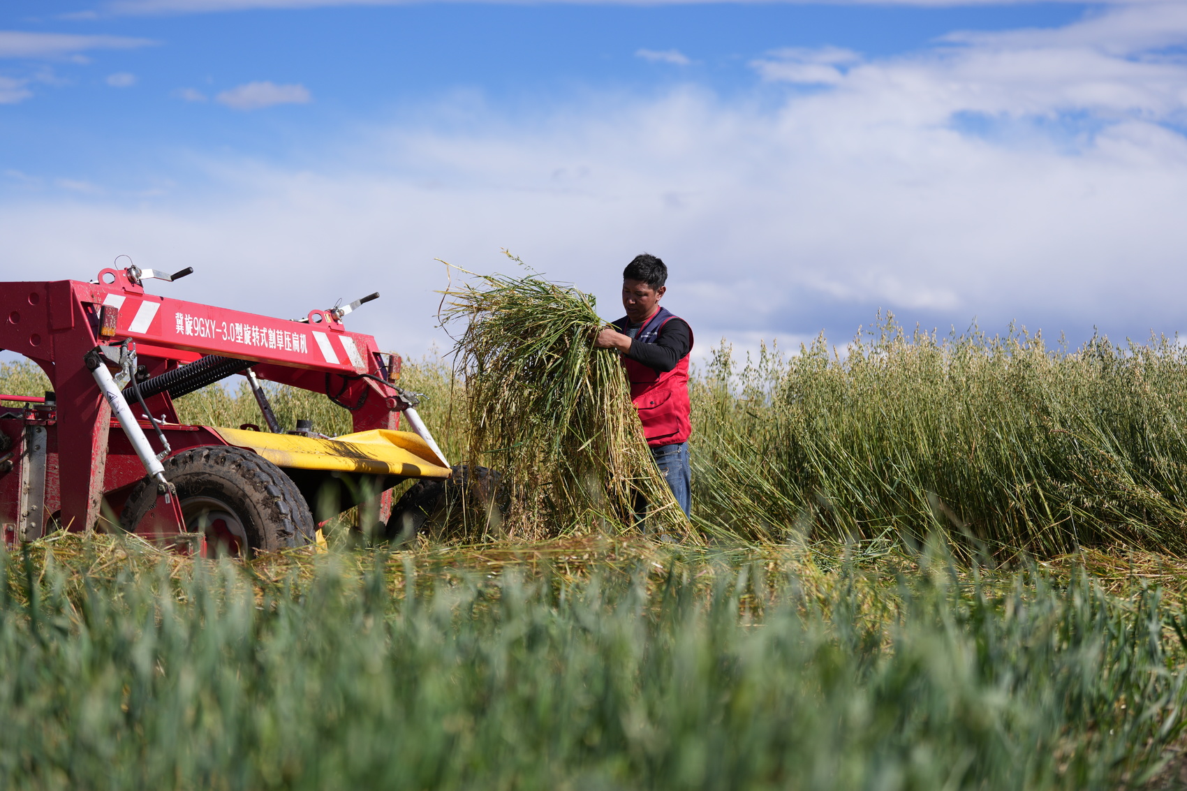 红原县益众农技服务专业合作社带头人旦真贡在收割牧草(资料图)。 红原县委宣传部供图