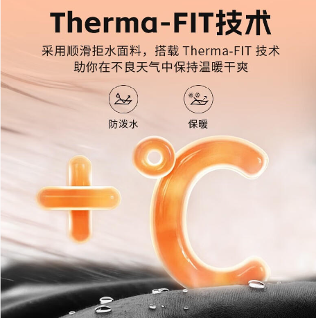 外层采用顺滑拒水面料,搭载 Therma-FIT 技术,防风拒水,即使在不良天气中保持温暖干爽,还能帮助内层保暖!