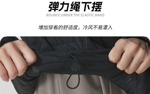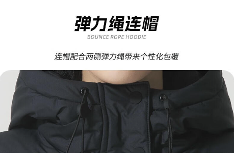 连帽增加弹力抽绳,保暖的同时减少束缚,带来个性化包裹。