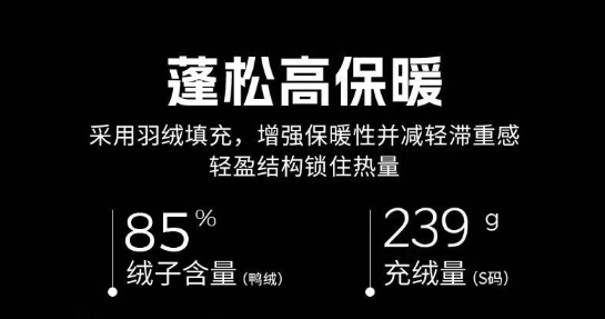 85%的绒子含量,239g充绒量(S码),填充优质羽绒,不仅保暖还特别蓬松~