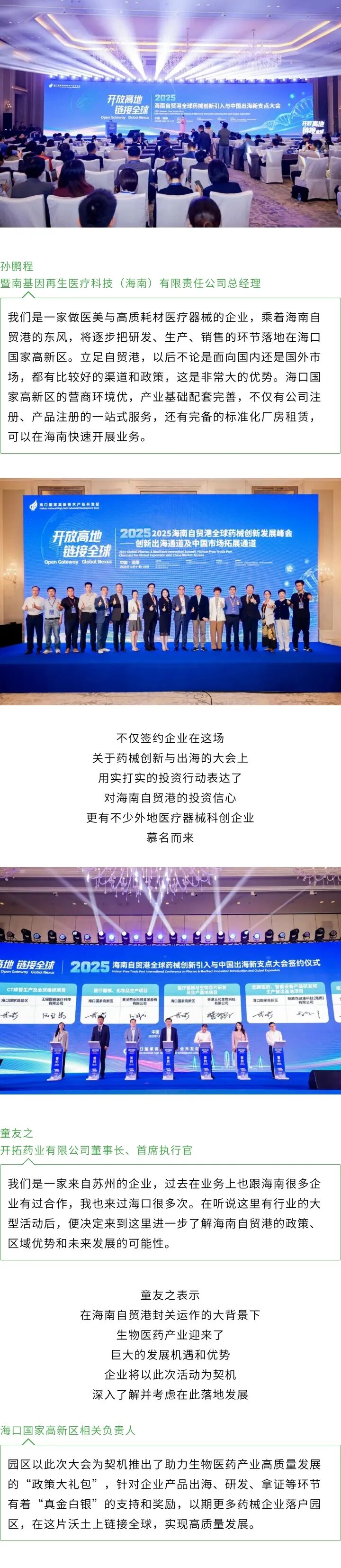 12月22日,以“开放高地,链接全球”为主题的2025海南自贸港全球药械创新引入与中国出海新支点大会在海口举办。在当日举行的主会场活动中,海口国家高新区与6家药械企业成功签约,总签约额10.3亿元,项目涵盖药械行业研发、生产、保税维修等多个环节,将进一步推动园区生物医药及医疗器械产业聚链、延链、强链。