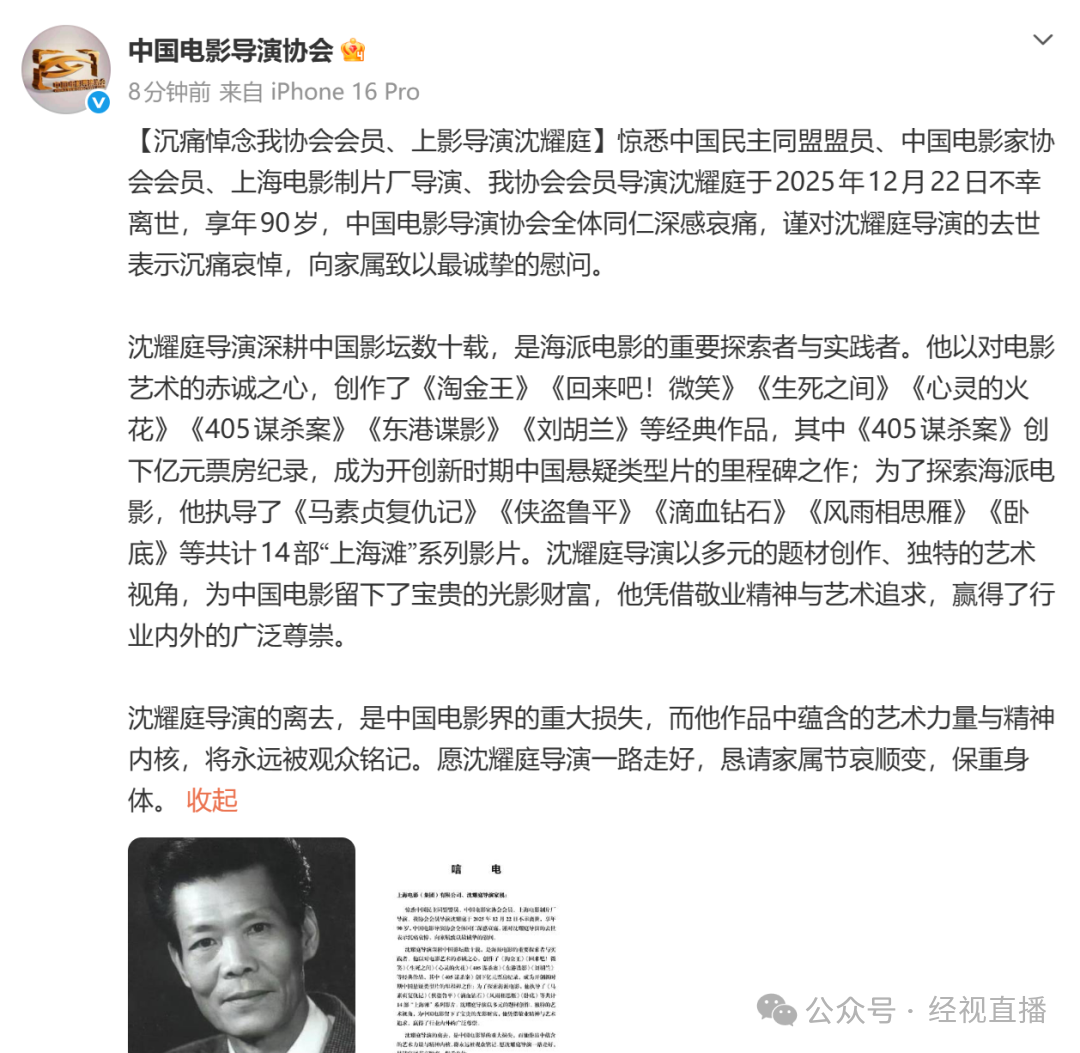 另据中国电影导演协会发布消息:上影著名导演沈耀庭于2025年12月22日不幸离世,享年90岁,中国电影导演协会全体同仁深感哀痛,谨对沈耀庭导演的去世表示沉痛哀悼,向家属致以最诚挚的慰问。