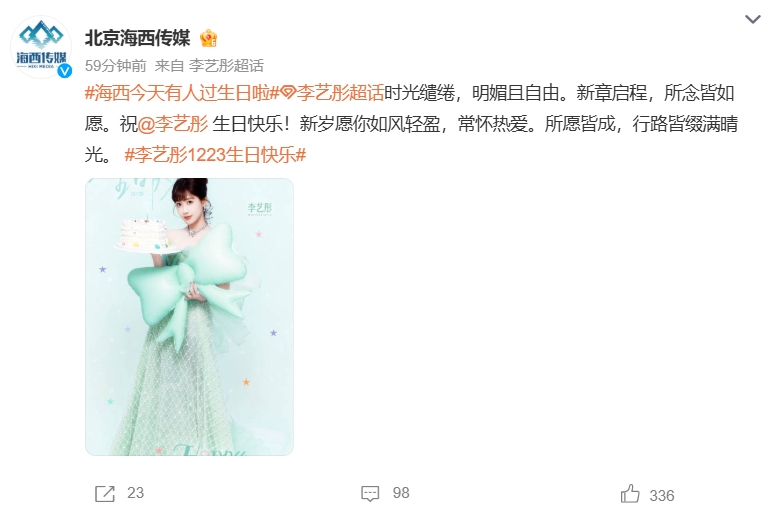 北京海西传媒发文祝福李艺彤生日快乐。称“时光缱绻,明媚且自由。新章启程,所念皆如愿。祝@李艺彤 生日快乐!新岁愿你如风轻盈,常怀热爱。所愿皆成,行路皆缀满晴光。”
