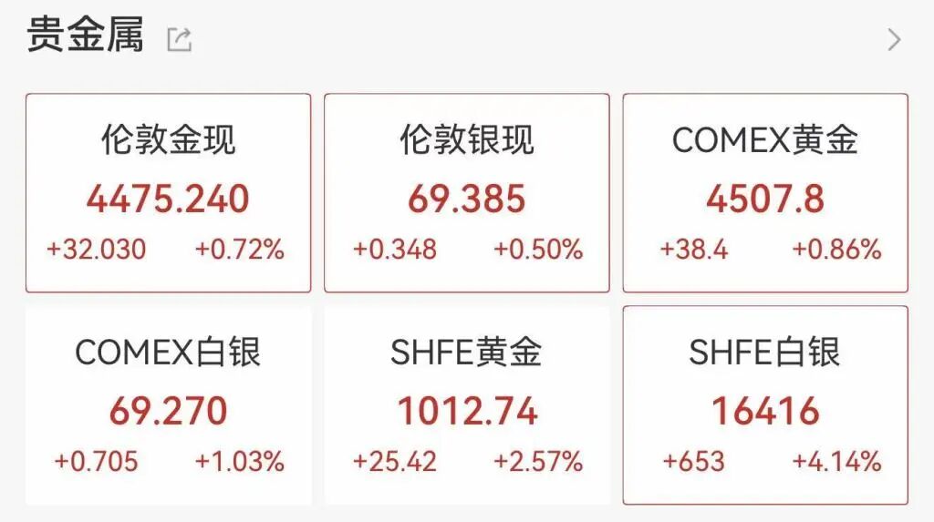 与此同时,COMEX黄金在相继突破4500美元/盎司、4510美元/盎司、4520美元/盎司关口后有所回落,截至发稿报4507.8美元/盎司,涨0.5%。