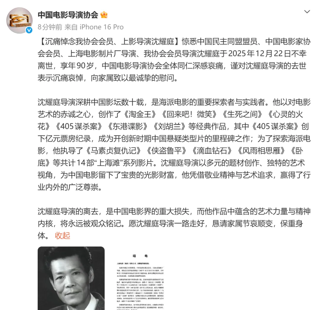 12月23日,中国电影导演协会发布唁电,上影著名导演沈耀庭于2025年12月22日不幸离世,享年90岁。
